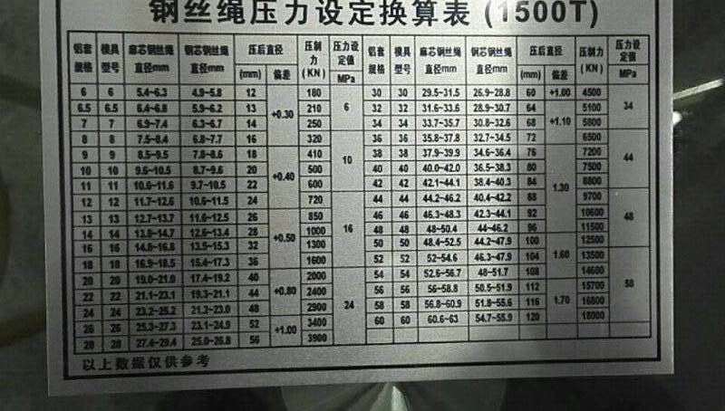 首先模具和鋁套型號是必須對應的,比如6mm鋁套就用6#壓套機模具,8mm鋁套就用8#模具,而鋼絲繩的尺寸不一定是整數(shù),廠家配的模具正常都是偶數(shù)配,壓到沒對應尺寸的鋼絲繩,這點不用擔心,模具都是有壓制范圍的,正常用1mm的上下范圍,比如15mm的鋼絲繩,可以用14mm或16mm的模具,總之最好的分別方法就是,不管鋼絲繩的尺寸是多少,找數(shù)值離得最近的模具就壓就可以了。還有一個重點,剛剛說的情況都是麻芯的鋼絲繩,而鋼芯的鋼絲繩正常都是比麻芯的鋼絲繩所用模具大一個型號。參數(shù)這樣的方法,客戶在使用鋼絲繩壓套機模具時就不會不知道如果選擇了。